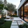 • Naturalne materiały: Użycie drewna, kamienia oraz innych naturalnych materiałów w elementach architektonicznych ogrodu, co łączy nowoczesny styl z naturą.
