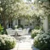 Reprezentacyjny kącik wypoczynkowy: Komplet mebli ogrodowych z miękkimi poduszkami, obok donic z kwiatami wiszącymi, takimi jak pelargonie czy fuksje, które dodadzą koloru i lekkości.